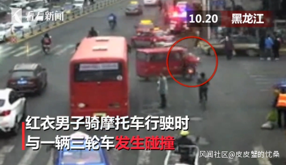 畫面中,執法人員拿着甩棍和一名手持兇器的紅衣男子對抗,男子在光天化日之下為何做出如此瘋狂舉動?事情還要從幾分鐘前説起:當時,路口的信號燈顯示為綠燈,這名紅衣男子騎摩托車向前行駛。這時一輛三輪電動車橫向行駛過來與摩托車發生碰撞。