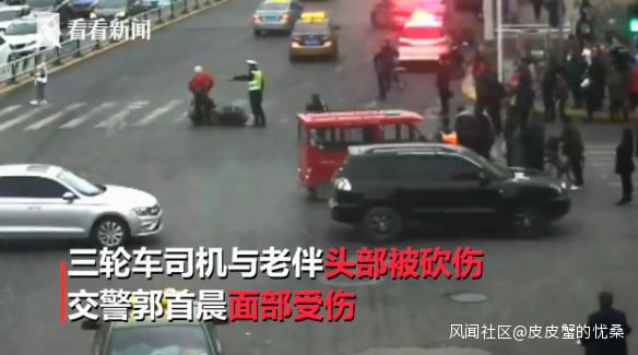 事發時,電動三輪車司機和老伴當時駕車送10歲的孫女去上課。三輪車司機和老伴的頭部被砍傷,郭首晨面部受傷,被120送往醫院救治。