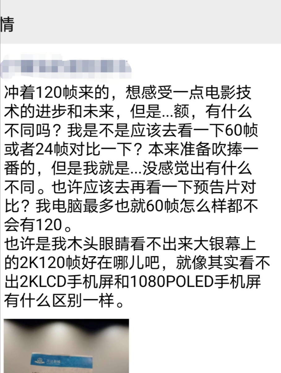 作為一個關注技術的人,我在感知120幀的優勢時,尚且如此困難(當然,這不排除個體因素限制的可能性)。如果一個普通觀眾和我出現了一樣的問題,他大概率不會去琢磨這後面的技術因素,而是……“我怎麼就白花了這麼多錢去看120幀?”,這就很麻煩了。