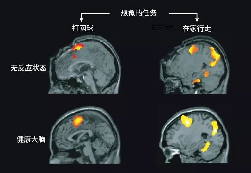 隨之而來的是一系列重大的科研突破,其中包括一名23歲女性的案例:她在2005年7月的一場車禍中遭受嚴重的大腦損傷,整個人處於無反應狀態,或者叫做清醒無意識狀態。她可以睜開眼睛,擁有睡眠-覺醒循環,但對於指令無反應,也沒有任何自主運動的跡象。車禍發生五個月後她依然處於這樣的狀態。當時在英國劍橋大學,現如今在韋仕敦大學工作的神經科學家Adrian Owen和他的同事們開展了一項史無前例的研究,他們向患者發出一系列口頭指令,在此過程中同時使用fMRI對該患者的大腦活動進行監測【1】。當團隊要求該患者想象打網球時,他們觀察到她大腦中的輔助運動區(supplementary motor area)出現了活動。團隊又讓她想象穿過自己家,結果患者大腦中三個與運動和記憶相關的腦區活動明顯增加。健康志願者接到相同的指示時,其大腦中也會有類似表現。