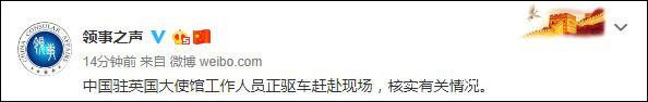 據外交部領事保護中心官方微博消息,中國駐英國大使館工作人員正驅車趕赴現場,核實有關情況。