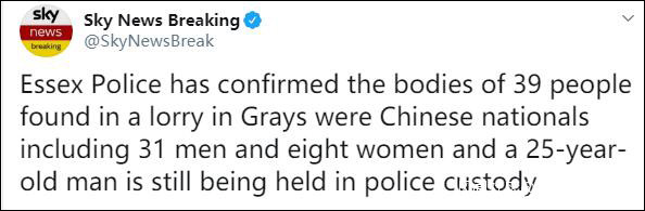 英國警方已經確認39名遇難者為中國公民,其中31位為男性,8位為女性。警方正在繼續對25歲的卡車司機莫羅賓遜質詢,後者因涉嫌謀殺被捕。