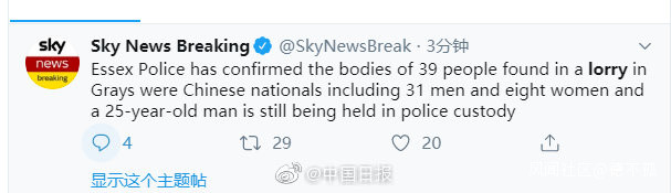 中國駐英大使館發言人發佈聲明稱:我們以沉重的心情看到英國媒體關於埃塞克斯郡發現39人死亡的報道,正與英國警方聯繫,核實確認相關情況。