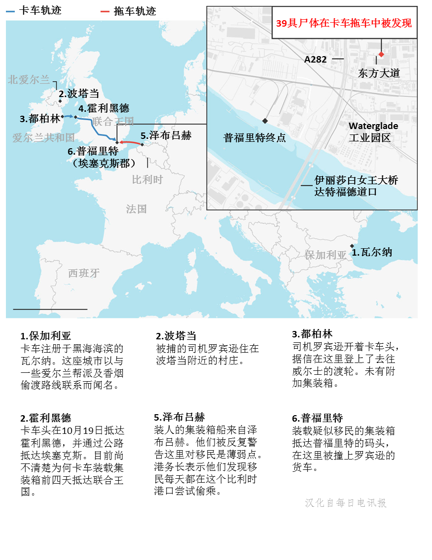 據案發時的消息稱,卡車與集裝箱來自保加利亞,從威爾士霍利海德港入境英國。但最新調查顯示,集裝箱是從比利時澤布呂赫港(Zeebrugge)運到倫敦東面的泰晤士河口港口珀弗利特,於當地時間10月23日凌晨被提取拉走。