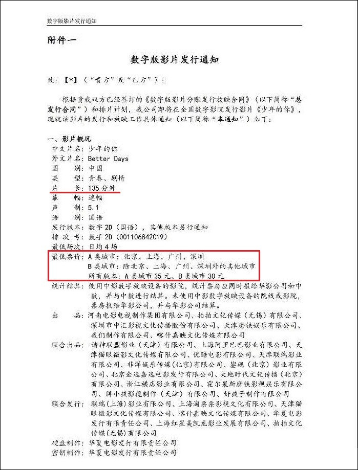 筆者日前獲得的一份影片發行通知顯示,《少年的你》的影片時長達到135分鐘。提供了該通知的知情人士告訴筆者,與此前未過審的版本比較“基本無刪減”,如果非要説有區別,就是一些血腥暴力的畫面以某種手法模糊處理了。