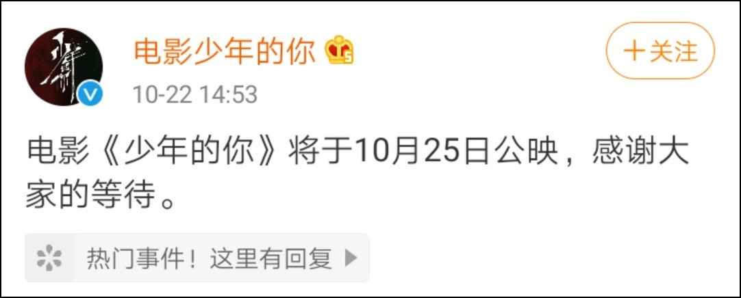 10月22日,電影《少年的你》在官微上宣佈,影片將於25日公映。