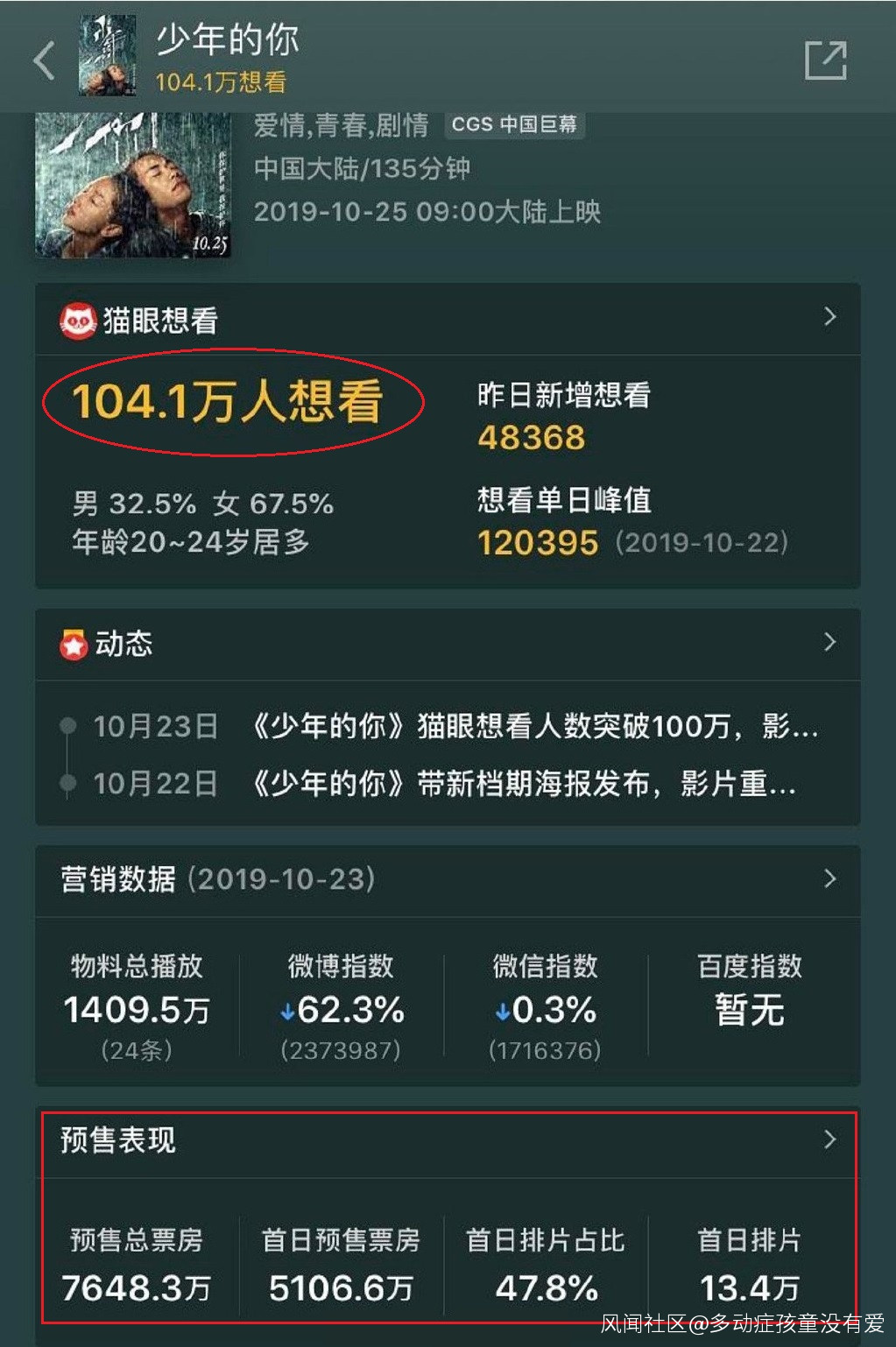 雖然片方低調,不代表着影片沒有熱度。我們可以看到,截止今天下午4時,貓眼數據顯示,在該平台上點擊“想看”的觀眾人數已達104.1萬人。該片預售票房更是高達7648.3萬元,其中首日排片佔比達到47.8%,接近一半;首日預售票房5106.6萬元。