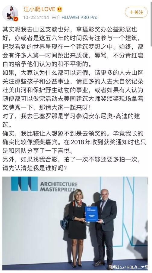對於這些質疑聲音,10月22日晚,江一燕發表長文,回應“美國建築大師獎造假”一事,稱自己這些年除了在山區支教,一直在專注參與一個建築,把看到的世界呈現在一個建築夢想之中。