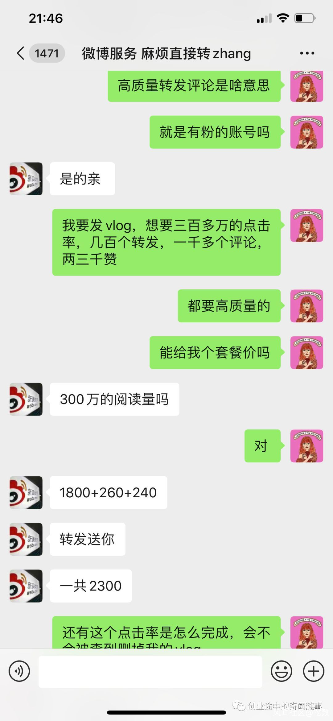 所有的現象都指向一個結果 - 殭屍粉。跟相關人士溝通後,店主發現一個視頻要在微博達到300萬閲讀、幾百轉發和一千多評論,只需要 2300元。