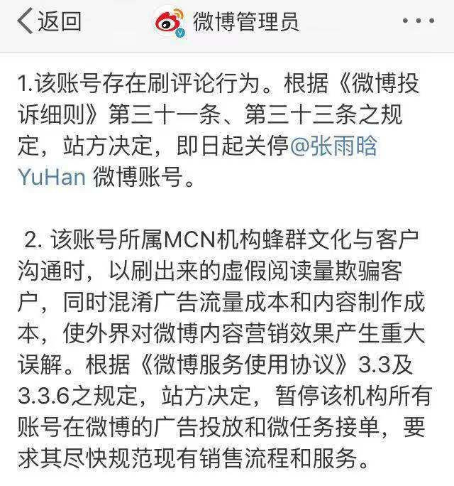 微博在10月19日公佈了處理結果,大V封號,機構暫停廣告業務。