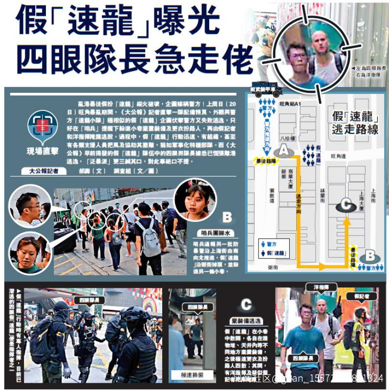 港媒稱,“假速龍”這次行動的全過程被一位在現場報道採訪的香港記者記錄了下來。記者還曝光了一些現場照片。一名戴眼鏡的“假速龍”指揮,在記者曝光其暴亂行徑和照片後十分驚恐,有消息稱其已極速離港潛逃,唯恐被香港警方追查拘捕。而此前公開煽暴的香港縱暴派在被問及有關“假速龍”的事情時,也變得三緘其口。