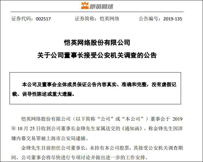 10月25日晚上,愷英網絡股份有限公司發佈公告説,董事長金峯因為涉嫌內幕交易罪被上海市公安局逮捕。