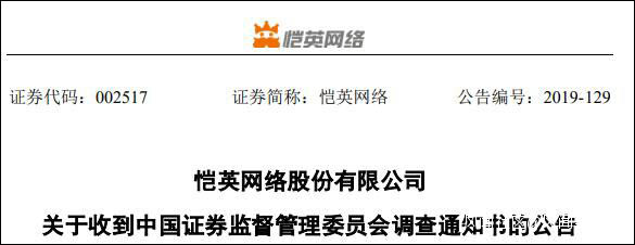 兩週前,10月9日愷英網絡發佈公告説證監會決定對公司進行立案調查。當天,愷英網絡開盤便“一”字跌停,股價創一年新低。截止當天收盤,愷英網絡股價報於2.58元/股,市值蒸發6億以上,相比巔峯時期已跌去近九成。