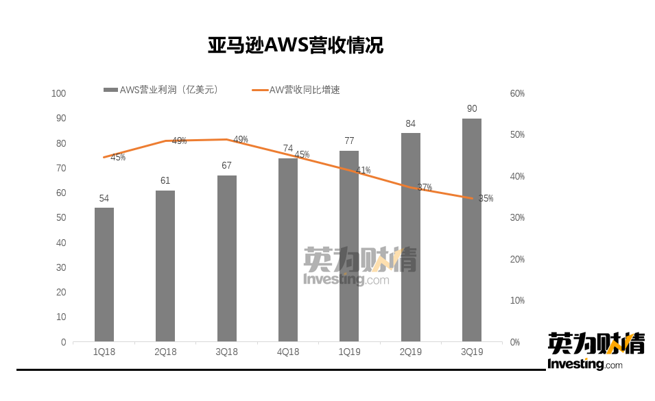 (亞馬遜AWS營收數據來自亞馬遜財報數據,製圖:英為財情Investing.com)在雲業務方面,AWS業務三季度營收為89.95億美元,同比增速僅為35%,這是2015年亞馬遜開始公佈這一數據以來,增速最慢的一次。過去四年,公司的大部分運營收入都來自AWS,所以此次增長大幅度放緩對於其未來的收益影響不可謂不大。本季度AWS的利潤貢獻佔全部利潤的72%,創出了八個季度新高。