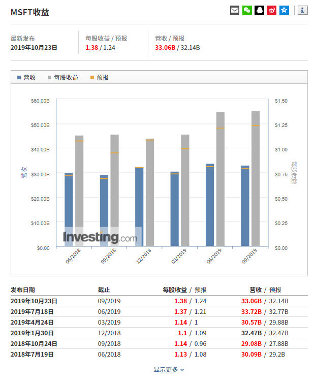 根據數據顯示,截至2019年9月30日,微軟公司2020財年的第一季度,總營收為331億美元,同比增長14%,而淨利潤為107億美元,合每股收益為1.38美元,同比增長21%。此前,華爾街的分析師預期為營收321.5億美元,EPS為1.25美元。