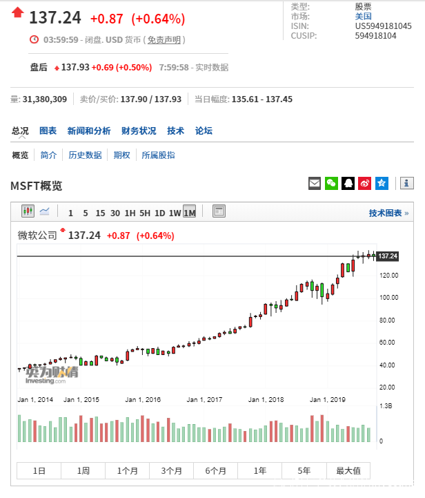 微軟今年以來股價累計上漲35.12%,週三公司股價收盤上漲0.6%,至137.24美元,市值為1.056萬億美元,財報公佈後,公司股價在盤後交易中下跌不到1%,隨後又上漲0.5%。