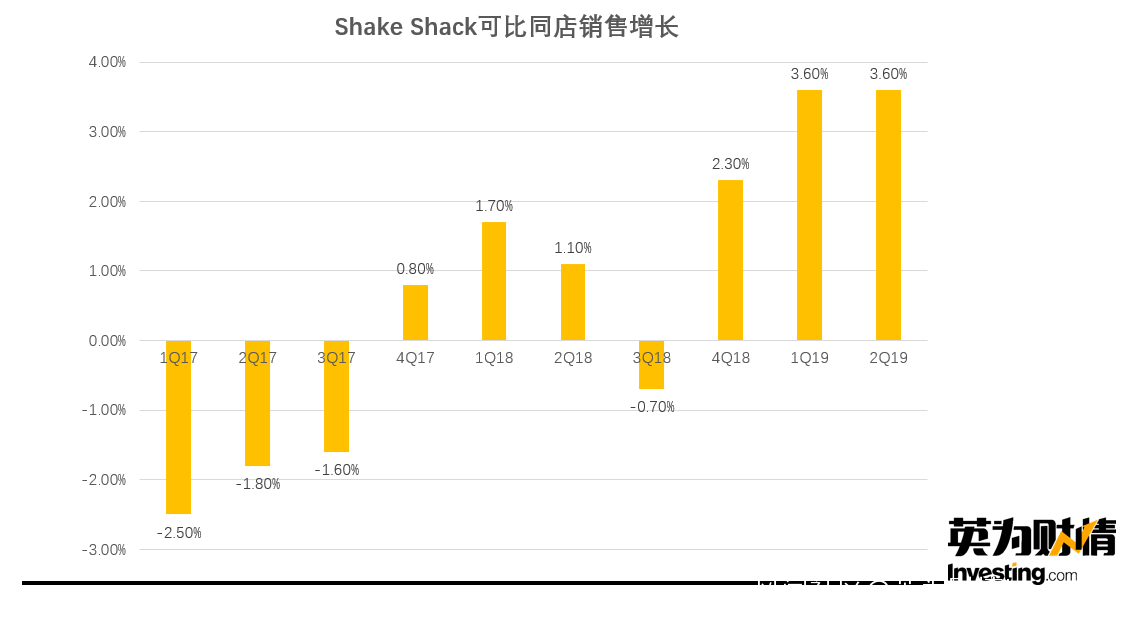 而今年來Shake Shack漲勢比較好的原因,是因為從四季度開始,同店銷售增長展現了比較樂觀的勢頭。年初以來,Shake Shack開設了21家新店,一、二季度的同店銷售均增長了3.6%;而且,在8月份公佈的二季度財報中,管理層上調了全年營收指引。