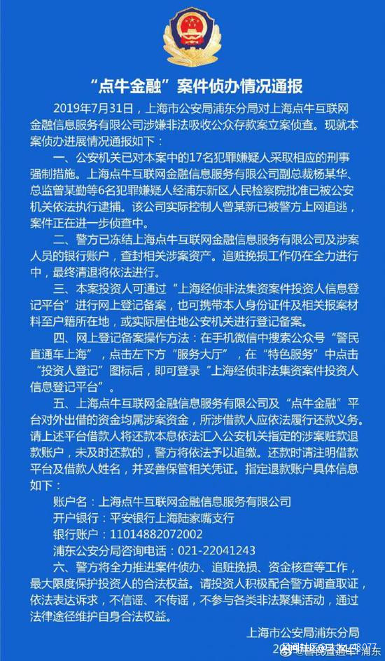 10月24日晚間,上海市公安局浦東分局官方微博“警民直通車-浦東”發佈公告,通報了“點牛金融”案件偵辦情況。