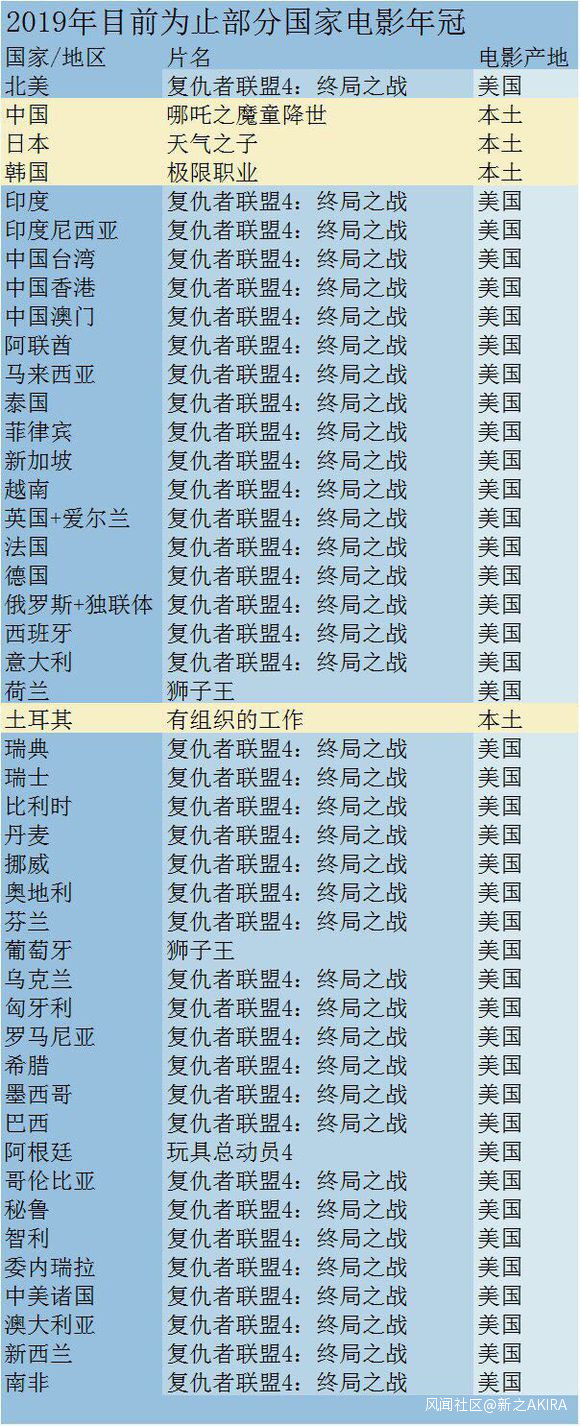 “補救”也好,“挽尊”也罷,但至少漫威系列是幫助好萊塢維持住了應有的繁華,最新的數據顯示,在2019年,全世界除了“奇葩”的中日韓三國,票房冠軍都被《復仇者聯盟》的終結篇所佔領。