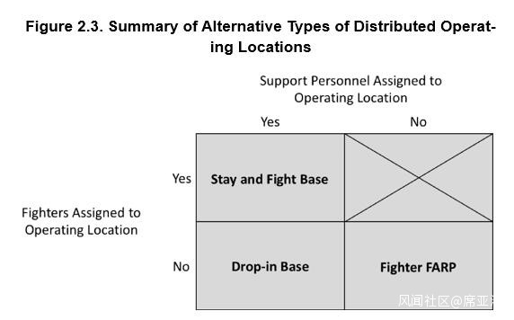 表2.4則顯示了上述三種基地同一時間設立的混合方式。當然了,有更多的部署方式和更復雜的選項,例如建立一個各自獨立的混成基地羣。隨着分佈式戰役行動的概念繼續發展,空軍應該繼續評估相關的成本問題。