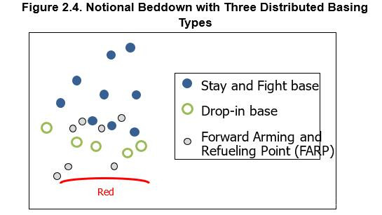 美國空軍可能將在對抗性環境中使用多種多樣的行動基地。正如我們將要分析的,分散程度越高意味着支援和防衞成本越高;因此,依賴分佈式基地的計劃需要在以生存為優先的高度分散和追求效率的集中部署之間進行取捨。為了取得平衡,一個辦法是暫時性使用疏散基地以提高生存率,同時保留固定有較完備設施的基地羣(這樣就可以通過永久性設施提高一部分效率同時儘可能降低集中度)。這兩種基地的組合方式受到多種因素的影響,包括具體的地理環境、政治准入情況、敵方能力、以及美國作戰支援能力。