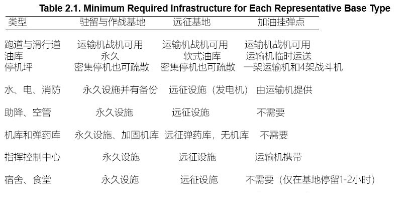駐留與作戰基地可以維持作戰行動時間較長,也有較強的從打擊中恢復的能力。而前進基地和FARP基地則用持久性換取機動性,並且能夠頻繁的調整部署。所有三種基地都依賴於持久的後勤支援能力和持續派遣戰鬥機。如表2.3所示,駐留與作戰基地將被用於戰鬥機的長時間部署,直到它被迫關閉。而前進基地只有在需要啓動使用的時候才有後勤人員進駐,而戰鬥機部隊不會長期停駐在這裏(可能會出現沒有戰鬥機進駐的情況);而FARP型的基地只是臨時用於補充彈藥燃油,平時沒有戰鬥機進駐。
