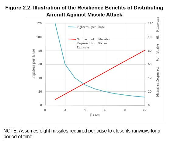 我們假設,迫使每個基地關閉一段時間,需要8枚戰區彈道導彈(TBM),則將上述120架飛機困在機場上需要的導彈數量就從8增長到80枚。同樣,隨着機場數量的增長,敵人的8枚導彈所能封鎖的飛機數量從120架降低到12架。
