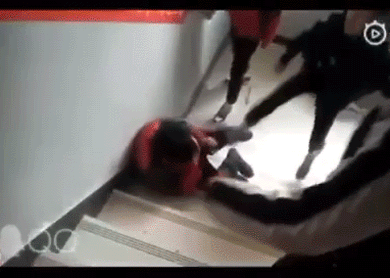 這位男生最初是站着被打,經不住五個人的拳打腳踢被打倒在地,只能蜷縮在樓梯,雙手抱頭,任人毆打。