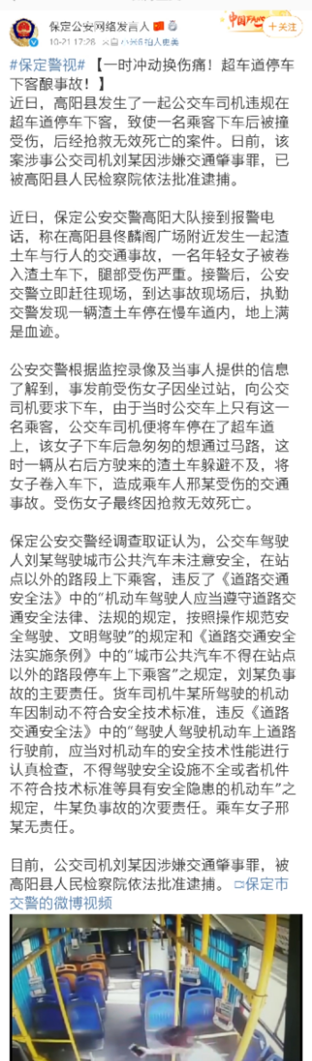 2019年10月20日,在河北保定高陽縣一位女乘客因坐過站要求公交車司機在站外停車,司機將車停在了超車道上,女子剛下車就被後方駛來的渣土車撞擊,瞬間被捲入車底。隨後,女子因傷重不治死亡。
