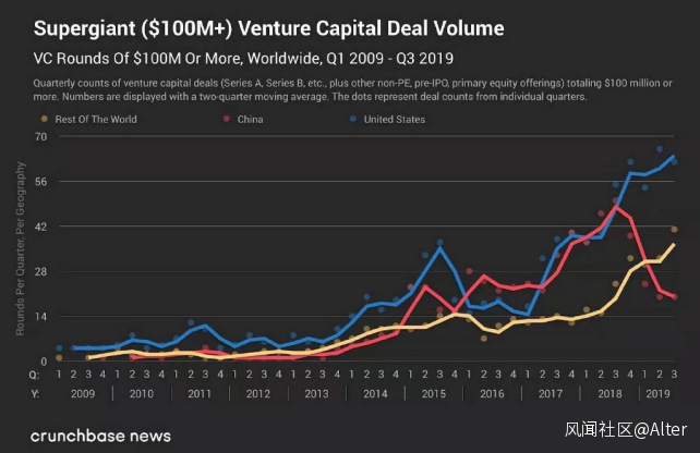 企業服務數據庫公司Crunchbase在日前的一份報告中,盤點了過去十年中全球A輪以上融資數量走勢圖,雖然美國及全球其他市場的A輪融資數量仍在持續增長,中國市場卻在2018年後出現了斷崖式下跌。