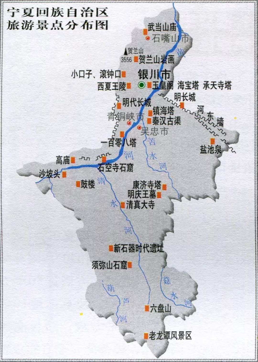 依寧東翰海東南高、西北低的地勢來説,我們需要尋找的是一條發源於隴東高原邊緣,向北在銀川平原東部注入黃河的河流。在這樣一片乾旱的土地上,這樣一條河流到底存不存在呢?答案是肯定的。它的名字叫作“苦水河”,由於西漢曾在苦水河匯入黃河的河口處始建“靈州縣”,並在後來的歷史中沿用下來,這條河流還曾被稱之為“靈州川”(此外還有山水河、安樂川、洛浦河等名)。