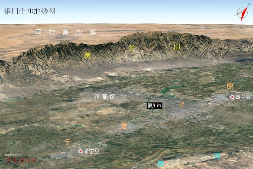 銀川平原位於賀蘭山主脈與鄂爾多斯高原的包夾之中,是整體西套平原的主體。當下行政上由銀川、石嘴山、吳忠三市所轄。之所以用“銀川”之名,是因為這座城市不僅位於整片中原當中,還有着自治區首府的行政地位加持。需要注意的是,很多時候銀川平原的概念會和寧夏平原/西套平原劃等號,但實際情況是在寧夏的西南部,賀蘭山餘脈與黃土高原還包夾出一塊麪積較小且相對獨立的平原。當下在此建制的為地級市屬性的中衞市,在沒有城市與之競爭的情況下,我們可將之命名為“中衞平原”或者“中衞盆地”。