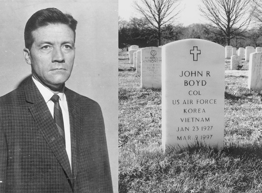 在伯伊德的葬禮上,政界、軍界高官雲集,海軍陸戰隊儀仗隊鳴槍致敬,一個資深上校在伯伊德的骨灰罐邊放上有地球和鐵錨的陸戰隊軍徽,這是海軍陸戰隊的最高敬意。海軍陸戰隊也在伯伊德去世後48小時內,提議伯伊德的家人將伯伊德畢生的研究筆記和藏書轉移到海軍陸戰隊學院圖書館中專門開闢的特別收藏室。但空軍除了樂隊和儀仗隊外,只派了一個根本不認識伯伊德的中將。多虧和伯伊德一起在朝鮮的天空就共同戰鬥過的退休將軍們出面,空軍派出4架F-15作空中分列式。但天氣實在惡劣,還是沒飛成。伯伊德在高層有很多朋友,國會出面問詢為什麼如此人才在空軍得不到賞識,空軍只得壓住火氣,將內利斯的假想敵中隊的大樓以伯伊德命名,以平息對空軍的指責。但是空軍心底裏還是對伯伊德的違規犯上和桀驁不馴極為不滿,不想豎這麼一個榜樣。