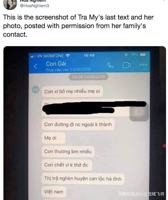 人權組織成員在推特發佈了Pham Thi Tra My最後發出的信息截屏。/推特截圖