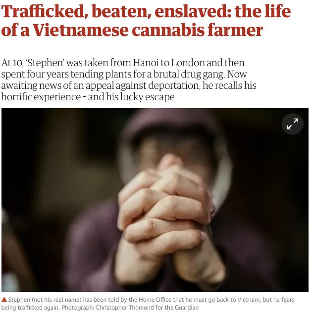 2015年,在英國警方的一次毒品搜捕行動中,16歲的斯蒂芬被捕,當警方確認他為人口販賣受害者時,斯蒂芬被送入一名牧師家寄養。去年,英國內政部要求已經成年的斯蒂芬返回越南。