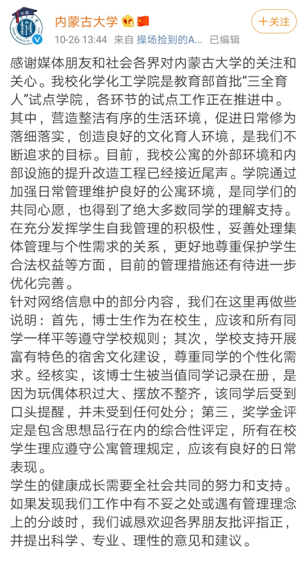 內蒙古大學微博10月26日消息,校方回應“女博士宿舍牀上放玩偶被通報批評”事件。全文如下: