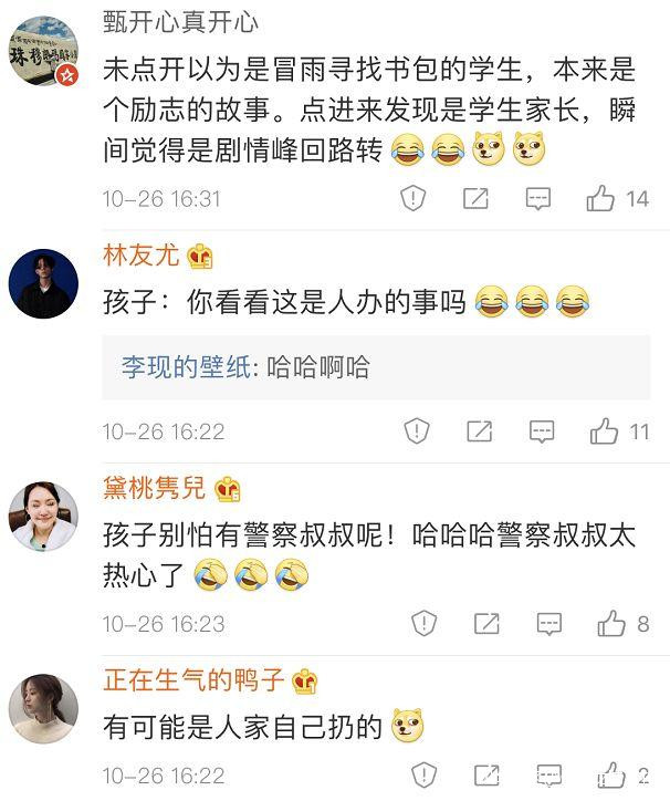 考慮到即將週末,孩子可能急需書本完成假日作業,於是民警照着作業本上的名字,對該年齡段住在附近叫此名字的小朋友挨個問詢,終於找到了正在冒雨四處尋找書包的孩子家長,將書包物歸原主。
