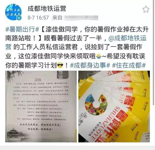 2018年8月,成都地鐵運營有限公司官方微博發佈一則消息,全網點名“漆佳傲同學”:“你的暑假作業掉在太升南路站啦!請快來領取哦!”