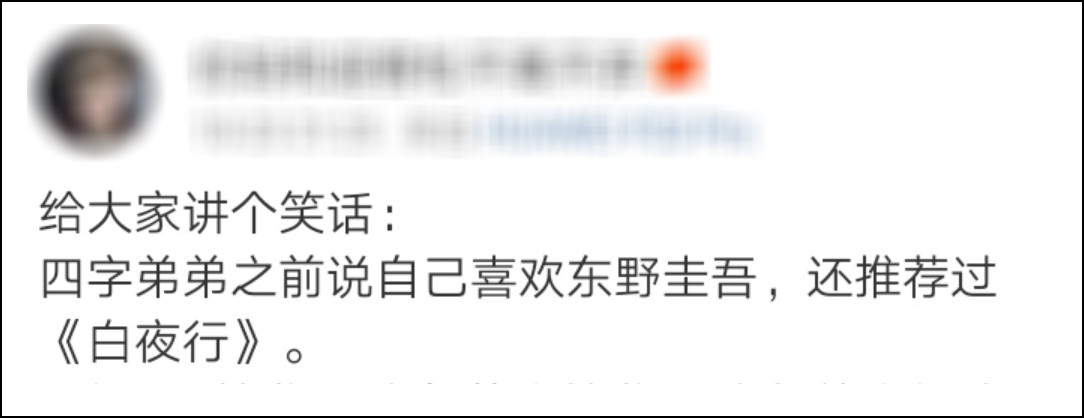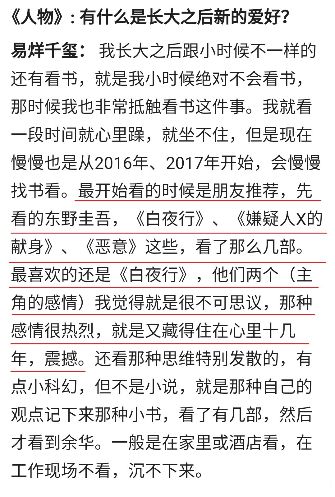 最起碼,易烊千璽現在是被網友挖出了,他在去年底受訪時就曾經談過自己在看東野圭吾的小説,而最喜歡的恰恰是《白夜行》。