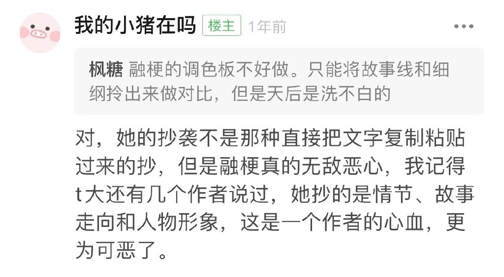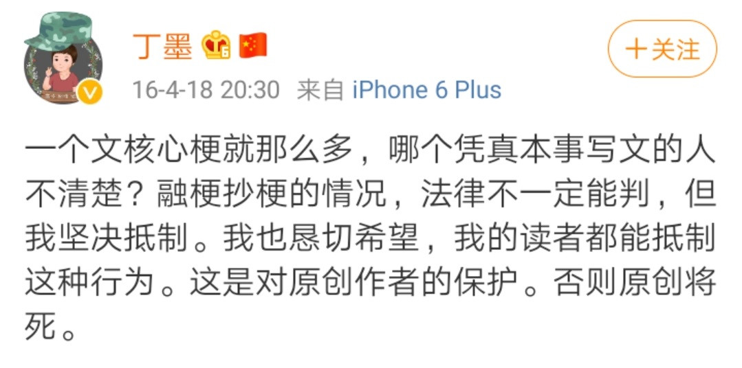 一個文核心梗就那麼多,哪個憑真本事寫文的人不清楚?融梗抄梗的情況,法律不一定能判,但我堅決抵制。我也懇切希望,我的讀者都能抵制這種行為。這是對原創作者的保護。否則原創將死。
