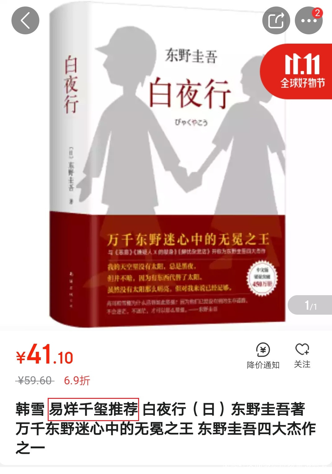 現在某些電商平台,在銷售《白夜行》時都打出了“易烊千璽推薦”的旗號。