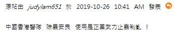 還有留言直呼止暴制亂,“中國香港警隊除暴安良,使用正當武力止暴制亂!”
