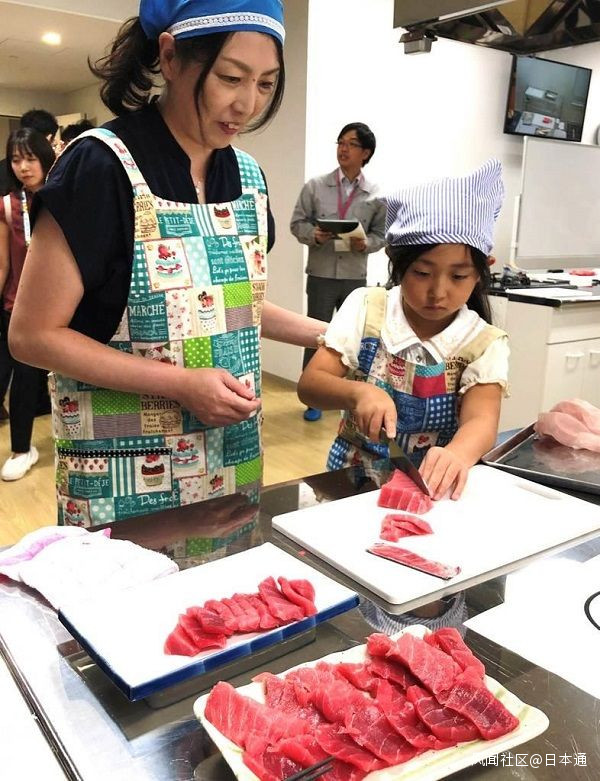 10月5日,豐洲市場舉辦了開業一週年慶祝活動。其中親子活動邀請了很多家長和孩子一同參與,經營者在一旁進行指導。一位家住東京都江户川區的惠子主婦(42歲)正在熟練的用菜刀處理金槍魚,她將為大家做一道壽司料理。在一旁學習的女兒笑着説:“我更喜歡吃魚了。”因為家人很喜歡吃魚,惠子經常在家做魚料理,她説:“想創作更多關於魚的菜品。”