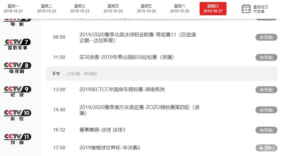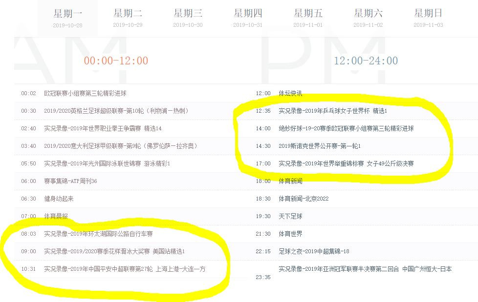 CCTV5的賽事預告目前已更新至下週日(11月3日):在軍運會閉幕後的第一天,在原本屬於NBA直播的時段,央視選擇錄播相對冷門的自行車、花遊比賽,以及重播上海上港和大連一方的中超聯賽。下午繼續“炒冷飯”,重播乒乓球女子世界盃賽事精選,然後是斯諾克世界賽。