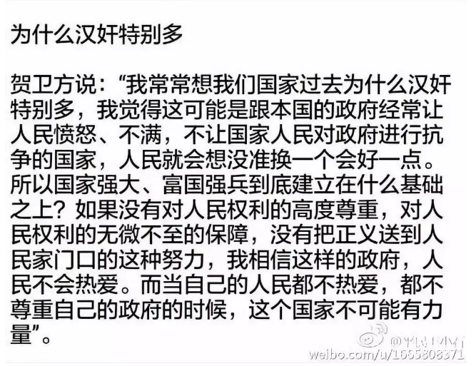瞭解賀公知的人,覺得從他口中説出這些話毫不奇怪。他把一小撮漢奸的有奶便是娘説成是“人民想”,這與他一貫以來的政治立場是一脈相承的。而與賀某並不同屬於一個陣營的另外一位網絡大V也説出類似的話,就令人費解了——