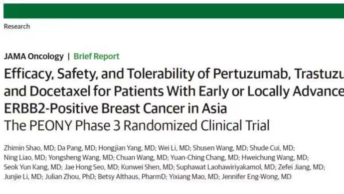 由復旦大學附屬腫瘤醫院邵志敏教授團隊聯合中國大陸、中國台灣、韓國、泰國等23個醫學中心開展研究成果證實:兩種腫瘤靶向藥物曲妥珠單抗和帕妥珠單抗“強強聯合”,雙靶新輔助治療方案,將使HER2陽性乳腺癌療效提升近一倍,這一成果在乳腺癌研究領域發出雙靶方案的“亞洲聲音”。北京時間昨夜23:30,研究成果在國際權威期刊《美國醫學會雜誌-腫瘤學分冊》(《JAMA Oncology》)在線發表,影響因子22.4。