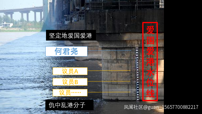 用圖片來説明一下。下圖是一座大橋,橋墩上面的黑白標尺叫做水位警戒標尺,用來標識水位是高還是低。如果我們把這個水位警戒標尺作為香港官員的愛國愛港水位線。水位線最高的是堅定地愛國愛港的,水位線最低的是仇中亂港的分子。那麼,在立法會的約70位議員裏,能敢於譴責暴徒的何君堯議員可以放在最高的位置。