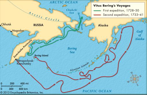 此時,西伯利亞的北冰洋海岸以及遠東地區的海岸線都還沒有被探明,而地圖上大海對岸的美洲北部海岸線也只是模糊的輪廓。為了探明這些區域,1725年,俄國的彼得大帝派遣地理學家兼航海家維塔斯·白令(Vitus Bering)率領一支船隊去考察並測繪這些海岸線,同時也探索一下遠東和北美洲之間是否有陸路相連。