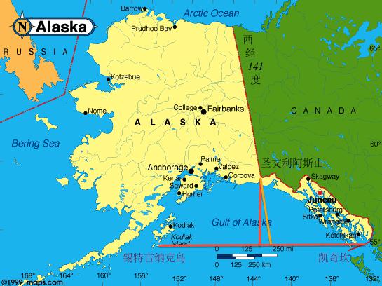 俄國和英國進行了漫長的邊界談判,雙方三度劃界。俄國在南界的問題上做出了退讓,最終把南界退到了北緯60度。作為補償,俄國在北方得到了一些以前不屬於它的土地,把阿拉斯加的東界劃在了西經140度。這還不夠,俄國人希望自己能控制整個阿拉斯加灣,以保護自己的商船和給遠東的艦隊提供必要的後備駐點,於是在第三次劃界的時候和英國進行了土地交換。