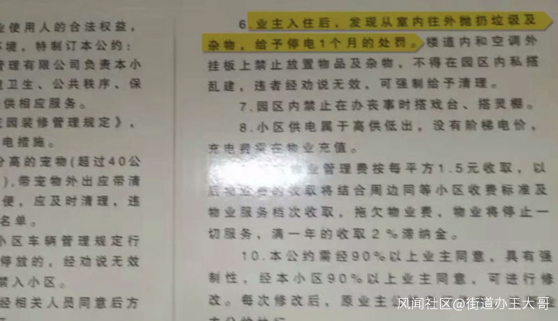 據業主規約顯示,業主入住後,被發現從室內往外扔垃圾及雜物,給予停電一個月的處罰;如果業主違反該小區裝修管理規定,經勸説無效,可採取停電措施。王虹介紹,停電一個月一般按30天算,這是業主規約中最嚴厲的處罰。“我們沒有執法權,不能罰款,希望以此對高空拋物行為給予警告,我們不希望這種行為危害公共安全。但如果高空拋物造成嚴重後果,比如有人員傷亡或比較嚴重的財產損失,除了斷電一個月,我們也會選擇報警處理。”